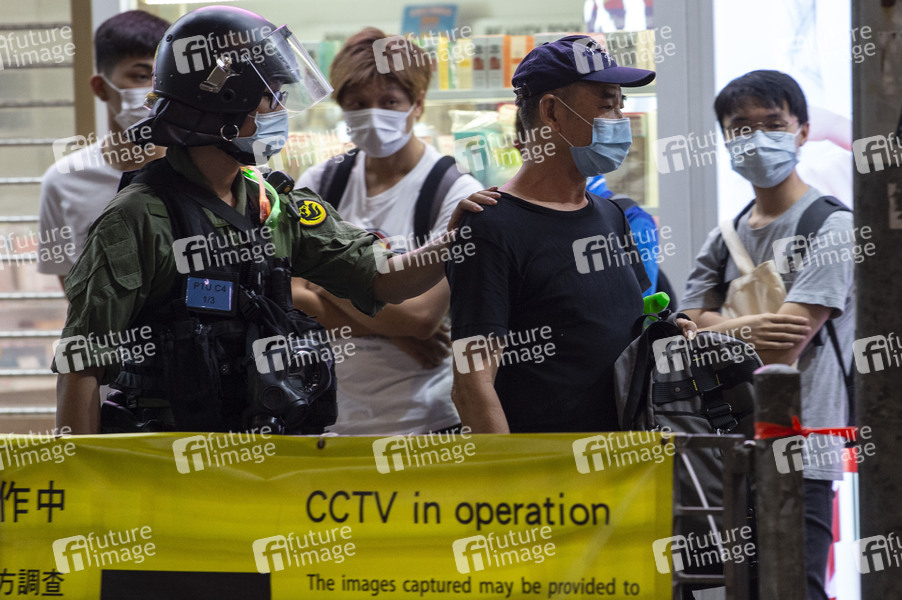 An dem Tag, an dem die Wahlen in Hongkong stattgefunden hätten, gehen Demonstranten auf die Straßen von Kowloon. Sie protestieren gegen die Einführung des nationalen Sicherheitsgesetzes und gegen die Verschiebung der HK-Wahlen um 12 Monate. Ein Demonstrant wird verhaftet. Hongkong, 06.09.2020