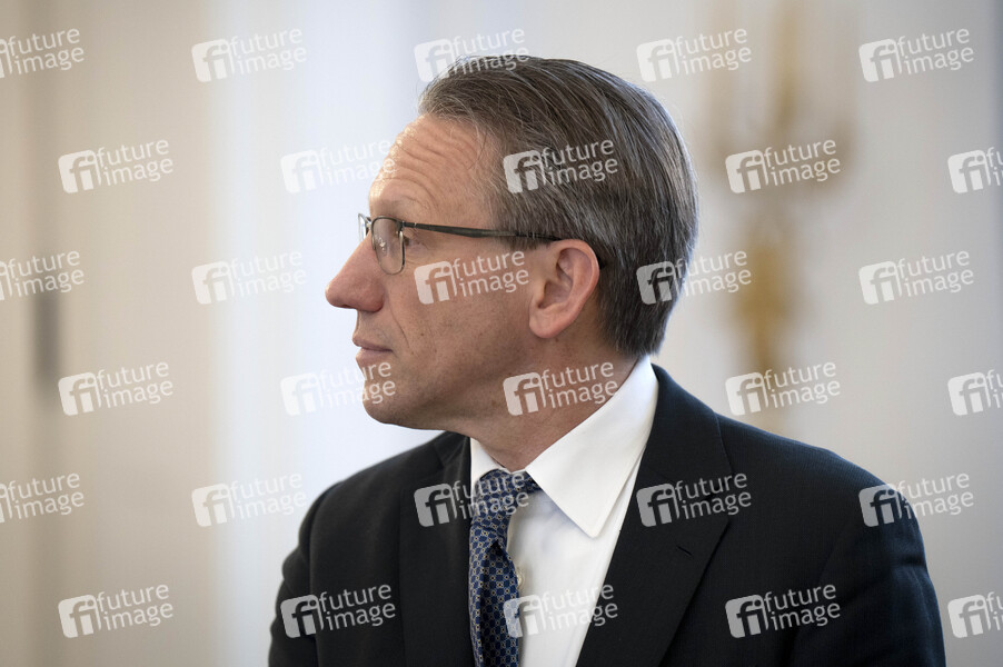 Jörg Kukies bei der Übergabe der Wohlfahrtsmarken 2025 durch den Bundesminister der Finanzen an den Bundespräsidenten im Schloss Bellevue. Berlin, 21.02.2025