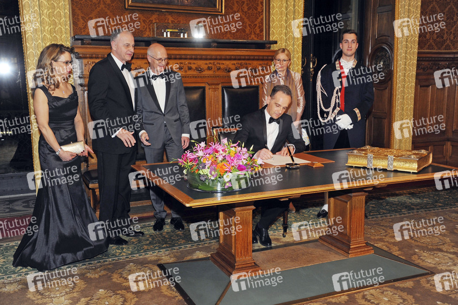 Carola Veit, Mircea Geoana, Peter Tschentscher, Heiko Maas und Eva Maria Tschentscher beim Eintrag ins Goldene Buch beim Matthiae Mahl im Rathaus Hamburg. Hamburg, 28.02.2020