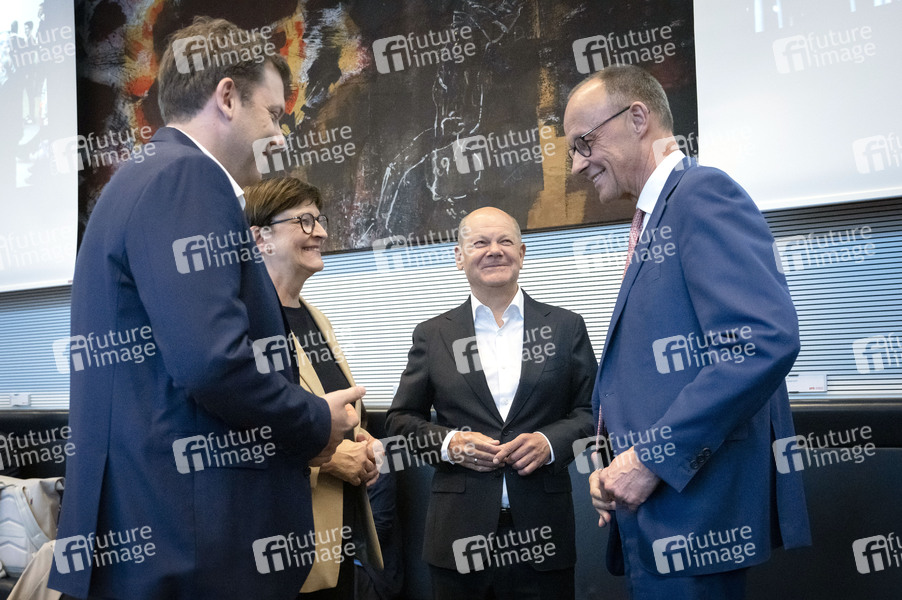 Lars Klingbeil, Saskia Esken, Olaf Scholz und Friedrich Merz bei der Fraktionssitzung der SPD-Bundestagsfraktion im Reichstagsgebäude. Berlin, 05.05.2025