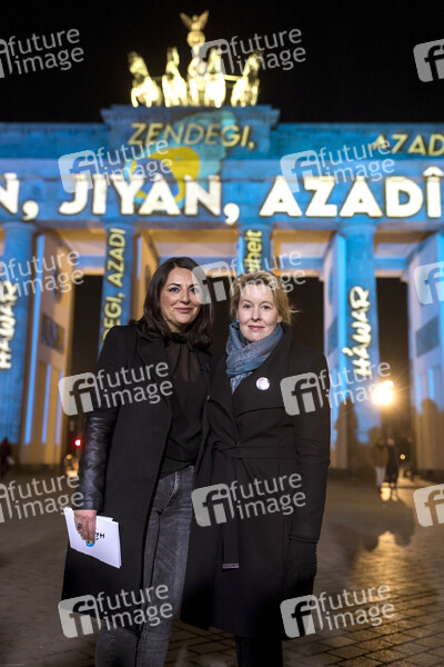 Düzen Tekkal (Gründerin und CEO von HAWAR.help) und Franziska Giffey (Regierende Bürgermeisterin von Berlin) posieren vor dem Brandenburger Tor. Der Schriftzug 'Jin - Jiyan - Azadi' (Frau - Leben - Freiheit) erleuchtet am Brandenburger Tor aus Solidarität zu den Demonstrationen im Iran. Die Veranstaltung wurde organisiert von der Nichtregierungsorganisation HAWAR.help in Zusammenarbeit mit der Stadt Berlin. Berlin, 13.12.2022