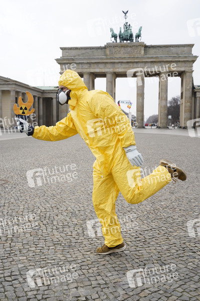 Aktivisten mit Strahlenschutzanzügen bei der Fotoaktion 'Radioactive Olympics - Solidarität mit den Betroffenen von Fukushima' am Brandenburger Tor. Berlin, 24.03.2021