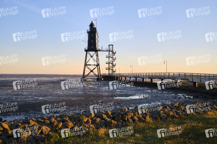 Eversand-Oberfeuer, Turm, Höhe 37.4 m, Gitterkonstruktion, runde Laterne, Sedhenswürdigkeit, Befeuerung, Schifffahrtszeichen, Positionsbestimmung, Abendstimmung
