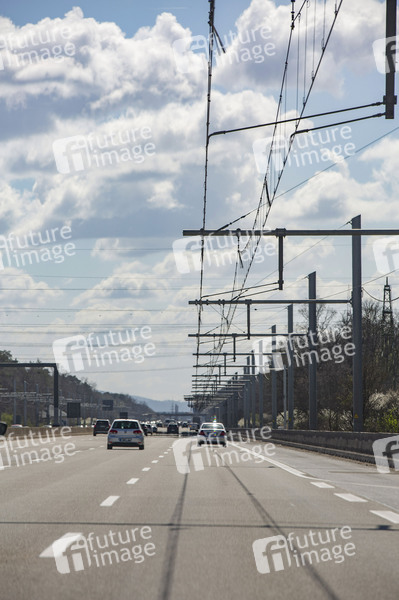 Oberleitungen über der rechten Fahrspur auf dem eHighway für den elektrifizierten Straßengüterverkehr auf der A5 zwischen Langen/Mörfelden und Weiterstadt im Rahmen des Projektes 'Elektromobilität bei schweren Nutzfahrzeugen zur Umweltentlastung von Ballungsräumen'. Mörfelden-Walldorf, 04.04.2021