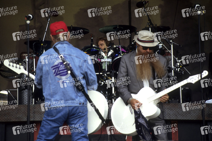 Dusty Hill, Frank Beard und Billy Gibbons von ZZ Top beim Soundcheck zum Konzert der 'Recycler World Tour' in der Milton Keynes Bowl. Milton Keynes, 06.07.1991