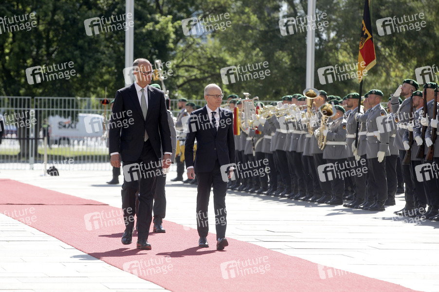 Friedrich Merz und Luc Frieden beim Empfang des Premierministers von Luxemburg mit militärischen Ehren zu einem gemeinsamen Gespräch mit anschließendem Pressestatement im Bundeskanzleramt. Berlin, 01.07.2025