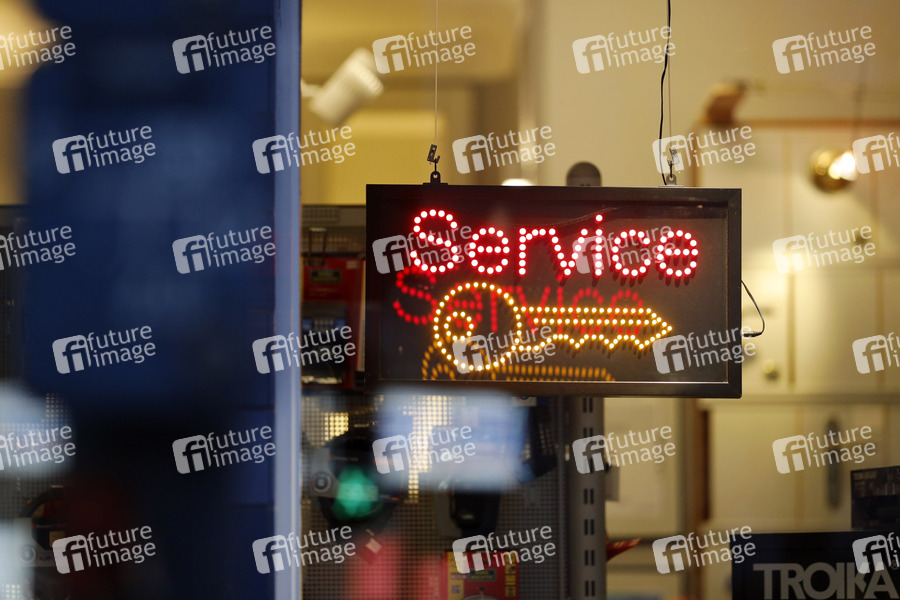 Eine Leuchtreklame für Schlüsseldienst Service an einem Fachgeschäft für Schlösser, Türen und Türschlösser. (Themenbild, Symbolbild) Köln, 12.04.2021