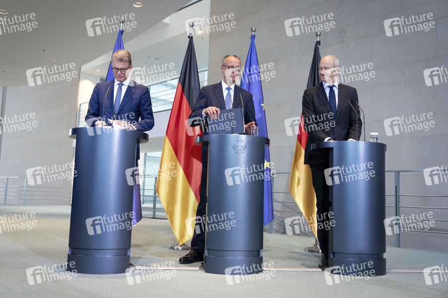 Christian Sewing, Friedrich Merz und Roland Busch bei der Pressekonferenz zur 'Made for Germany' Initiative im Bundeskanzleramt. Berlin, 21.07.2025