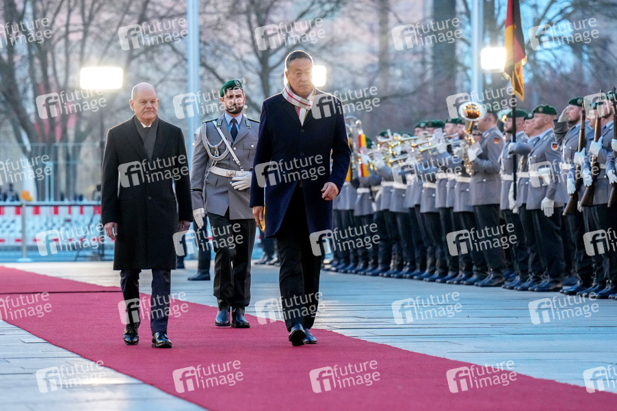 Olaf Scholz und Srettha Thavisin beim Empfang des Ministerpräsidenten von Thailand mit militärischen Ehren und zu einem gemeinsamen Gespräch mit dem Bundeskanzler und anschließendem Pressestatement im Bundeskanzleramt. Berlin, 13.03.2024