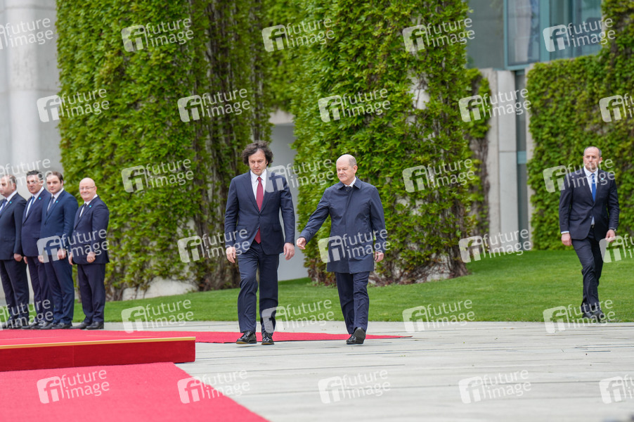 Irakli Kobachidse und Olaf Scholz beim Empfang des Premierministers von Georgien mit militärischen Ehren und zu einem gemeinsamen Gespräch mit dem Bundeskanzler mit anschließendem Pressestatement im Bundeskanzleramt. Berlin, 12.04.2024