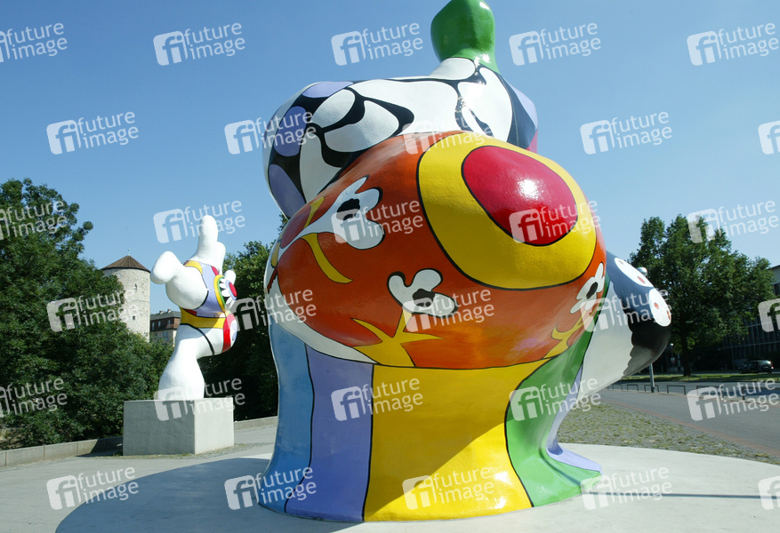 Kunstwerk von Niki de Saint Phalle von 1974, Frauenfiguren mit überdimensionierten Geschlechtsteilen