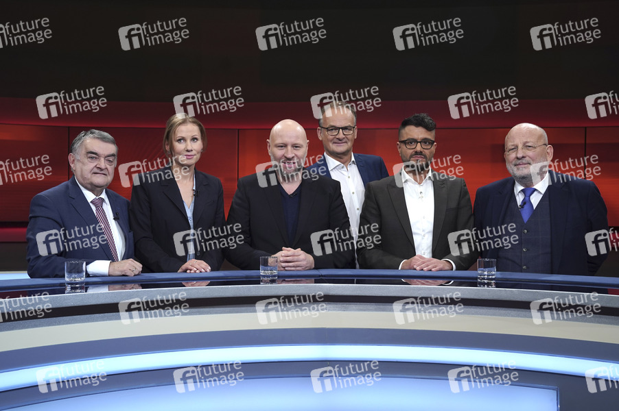 Herbert Reul, Dorothee Dienstbühl, Olaf Sundermeyer, Frank Plasberg, Ahmad A. Omeirate und Laszlo Anisic in der ARD-Talkshow 'hart aber fair' im WDR Fernsehstudio A. Köln, 25.11.2019