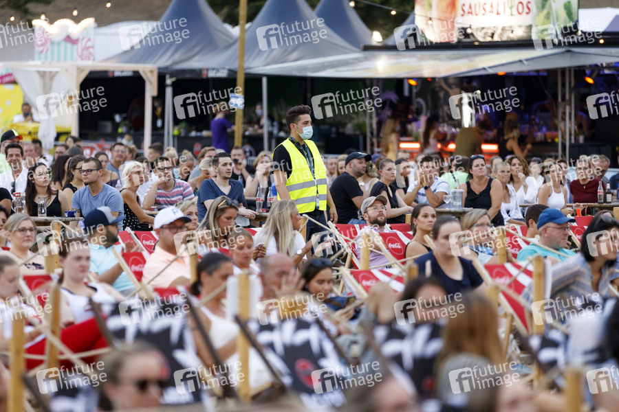 Ordner mit Mundschutz beim Auftritt von Oliver Pocher und Amira Pocher mit dem Programm 'Die Pochers hier!' live im Kulturgarten in der Bonner Rheinaue. Stehende Personen müssen einen Mundschutz tragen. Das Bonn Live Kulturgarten Open Air Festival 2020 ist Europas erstes Open Air Festival unter Corona-Auflagen wegen der Covid-19 Pandemie. Bonn, 09.08.2020