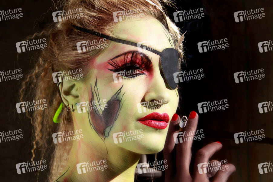 Bodypainting, Erotik, Frau, Mädchen, nackt, draußen, weiblich, Körperkunst, Kunst, Malerei, Augenklappe, rauchen, Zigarette, erotic, woman, girl, nude, outdoor, female, body art, body painting, eyepatch, smoking, cigarette