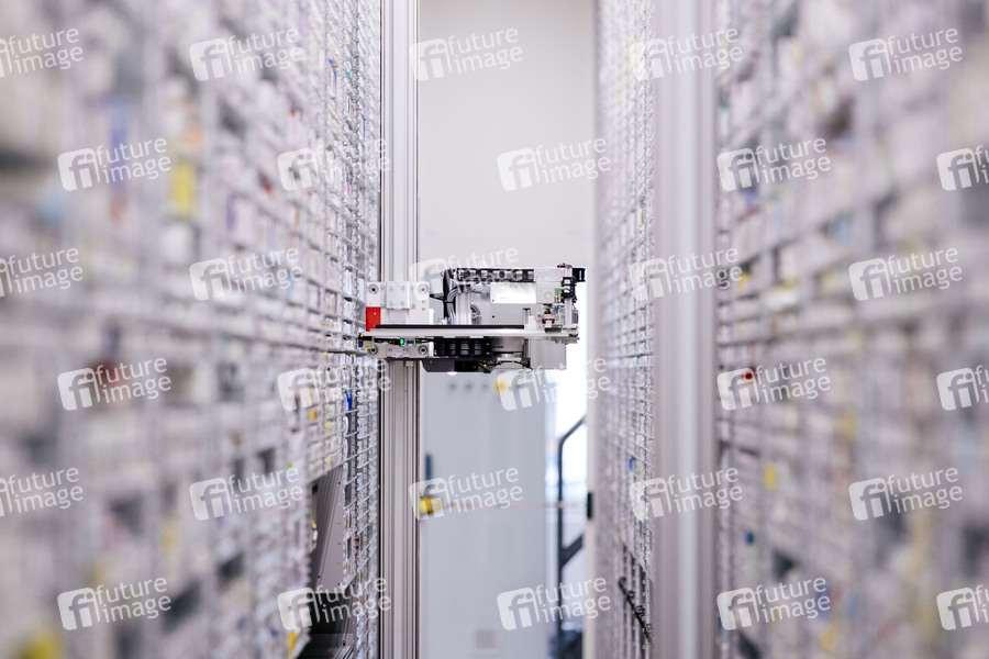 Im modernen Versorgungszentrum der Kronen-Apotheke Marxen OHG unterstützt der Roboter Knapp-Store die Mitarbeiter bei der Auswahl, Portionierung und Verteilung von Medikamenten für Krankenhäuser und Kliniken. In einem angrenzenden Labor mit Reinraum werden zudem Zytostatika für die Krebs-Therapie unter sterilen Bedingungen hergestellt. (Themenbild, Symbolbild) Wesseling, 27.05.2021