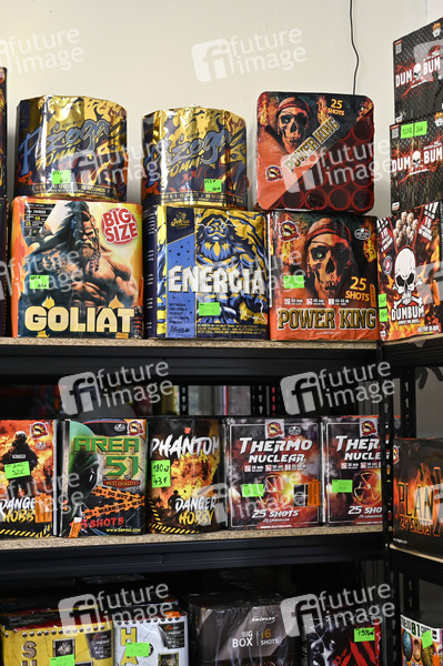 Verkauf von Feuerwerk auf dem Wochenmarkt im Deutsch-Polnischen Grenzgebiet Görlitz-Zgorzelec am 30.12.2024. In Deutschland ist Feuerwerk der Kategorie 3 verboten. Wenige Tage vor dem Jahreswechsel warnen Feuerwehr und Polizei vor dem Abbrennen illegaler Pyrotechnik. Durch den unsachgemäßen Umgang mit in Deutschland nicht zugelassenem Feuerwerk können schweren Verletzungen entstehen. Denn in der Nacht zum Jahreswechsel wird immer wieder auf sogenannte Polen-Böller zurückgegriffen, die in Deutschland keine Zulassung haben. Die Zulassung von Feuerwerk unterliegt in Deutschland strengen Vorgaben, die im Sprengstoffgesetz geregelt sind. Danach dürfen nur Silvesterknaller mit einer Nettosprengmasse von maximal 6 Gramm verkauft werden. (Symbolfoto, Themenfoto) Zgorzelec, 30.12.2024