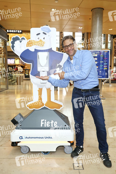 Patrick Bach beim Fototermin mit Service-Roboter 'Fiete', einem mobilen Spender für Hand-Desinfektionsmittel der Firma Autonomous Units, in der Europa Passage, Hamburg, 28.11.2022
