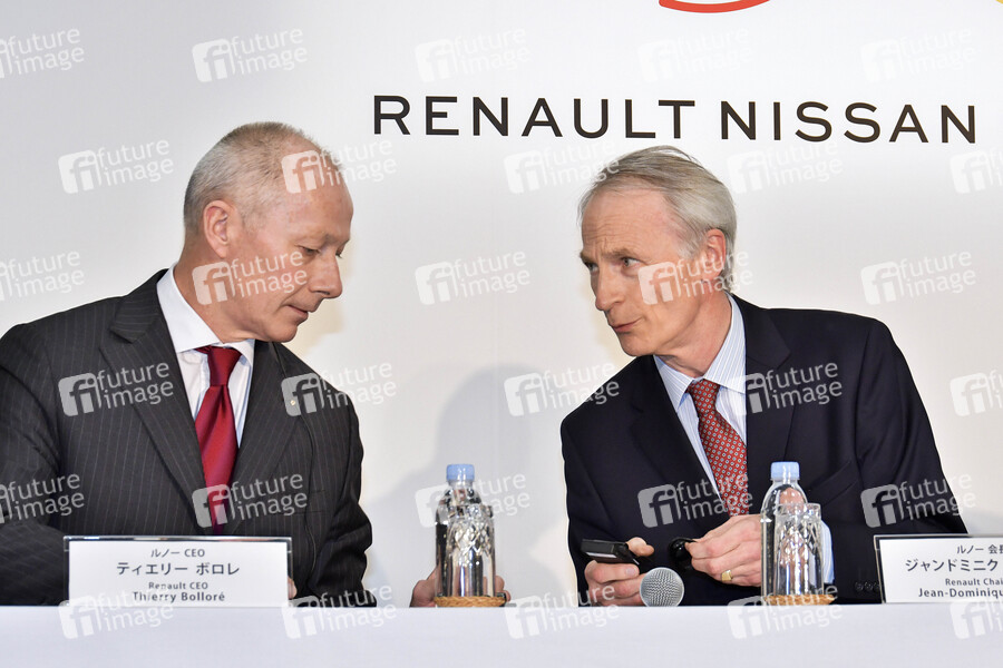 Thierry Bollore und Jean-Dominique Senard bei einer Pressekonferenz der Renault-Nissan-Mitsubishi Motors Corporation im Nissan Global Headquarter. Yokohama, 12.03.2019