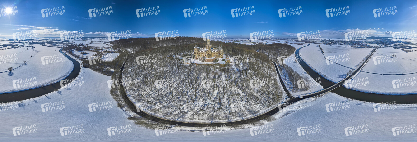 offizieller Wohnsitz der Prinzen von Hannover, Welfen, Bauzeit 1857-1867, Ernst August von Hannover, Neugotik, Architekt: Conrad Wilhelm Hase, Pattensen, Schnee, Winter, Winterlandschaft, Berg, Burg, Ausflugsziel, Sehenswürdigkeit, Luftaufnahme, Luftbild