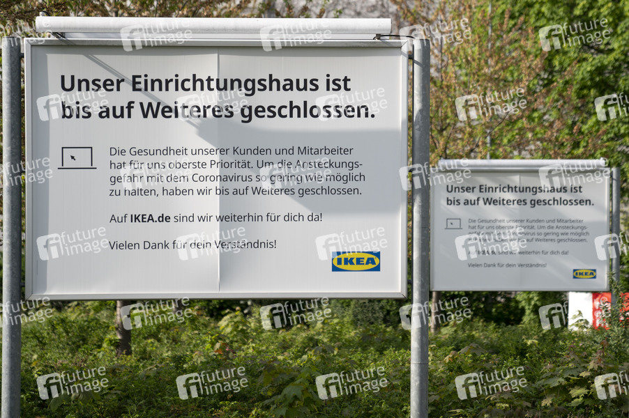 Ikea-Logo, Ikea-Schriftzug, Möbel, Möbelhaus, Inneneinrichtung, Wohnung, Wohnen, Wohnzimmer, Esszimmer, Kinderzimmer, Schlafzimmer, Badezimmer, Wohnkultur, Einrichtungshaus, Großhändler, Discount, Einkaufen, Shopping, Einrichtungskonzern, IKEA-Filiale, IKEA-Katalog, IKEA-Regal, Einrichtungsideen, IKEA-Markt, Möbel-Konzern, Konzern, Konsum, Unternehmen, Firma, Ersteinrichtung, Möbel zusammenbauen, DIY, Do it yourself, Wirtschaft, IKEA GmbH & Co. KG, Coronakrise, Corona-Krise, Kontaktverbot, Abstandsregel, Versammlungsverbot, Seuchenschutz, Quarantäne, Quarantänemaßnahme, Ausgangssperre, Mindestabstand, Social Distancing, Kontakt verboten, Ausgangsbeschränkung, Coronaviren, Virus, Viren, Corona, Covid-19, Coronavirus, Coronaviren, Corona-Virus, Corona-Viren, Ansteckungsgefahr, Epidemie, Pandemie, Infektion, Infektionen, Corona-Angst, Ansteckungsangst, Seuche, anstecken, Krankheit, Vorbeugung, Prävention, schützen, Schutz, Ausnahmezustand, Risiko, Risikobewertungen, Maßnahmen, Coronamaßnahmen, Corona-Infektion, Corona-Infektionen, Corona-Schutz, menschenleer, #stay home, #stayhome, Symbolfoto, Symbolbild