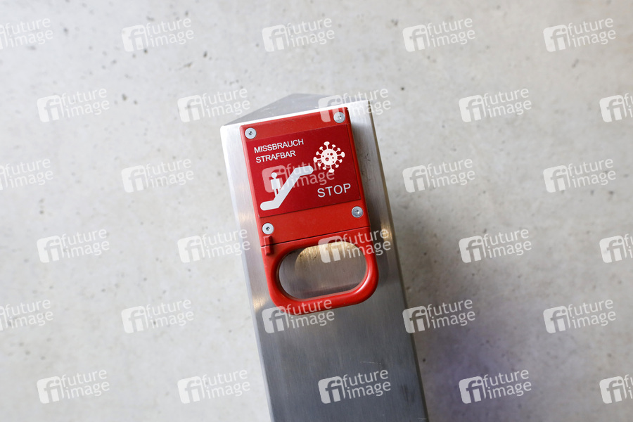 Fotomontage: Eine Notbremse mit einem Corona-Symbol. NRW: Das Ministerium für Arbeit, Gesundheit und Soziales hat auf Grundlage der neuen Coronaschutzverordnung die Corona-Notbremse für 31 Kreise und kreisfreie Städte angeordnet. Im Bild eine Notbremse an der Berliner Haltestelle Bundestag. (Fotomontage, Themenbild, Symbolbild) Berlin, 27.03.2021