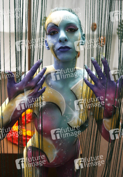 Bodypainting und Fotoshooting mit Model Sarah am Tag der offenen Tür der Meisterschule Justus-von-Liebig-Schule, Abteilung Floristik in Hannover-Ahlem. Künstler: Jörg Düsterwald