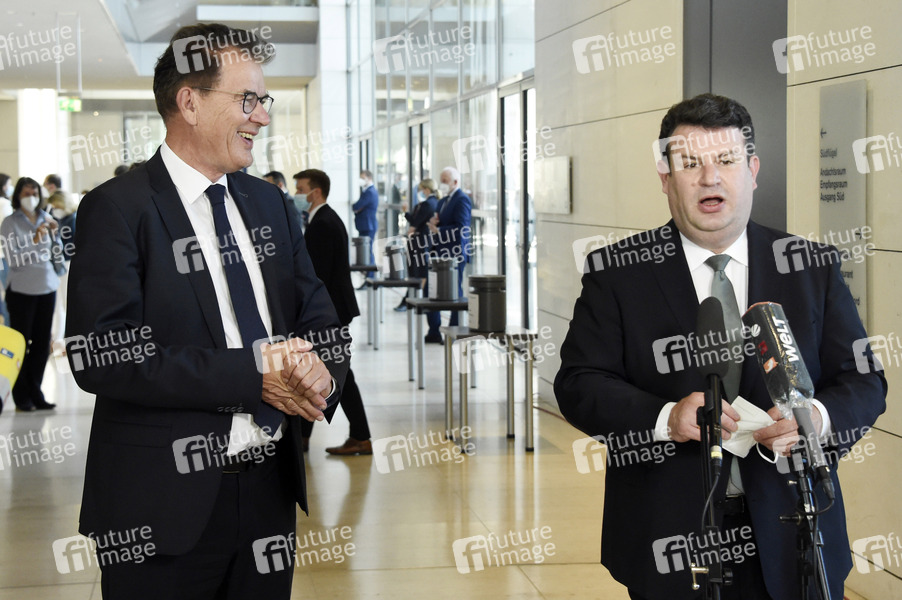 Gerd Müller und Hubertus Heil bei einem Pressestatement am Rande der 234. Sitzung des Deutschen Bundestages im Reichstagsgebäude. Berlin, 11.06.2021