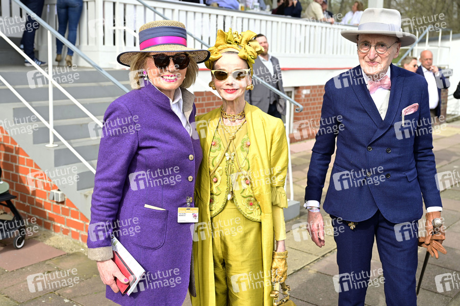 Tini Gräfin von Rothkirch, Britt Kanja und Günther Krabbenhöft bei der Großen Saisoneröffnung 2024 auf der Rennbahn Hoppegarten. Berlin, 31.03.2024