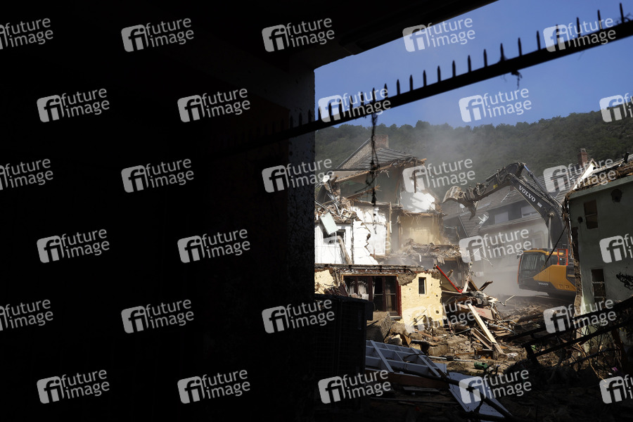 Nach dem Jahrhunderthochwasser in der Eifel durch heftige Regenfälle und Dauerregen mit Überschwemmungen und Überflutungen haben die Aufräumarbeiten im Ahrtal begonnen. Einheiten von Polizei, THW, Bundeswehr und Feuerwehr mitsamt vielen freiwilligen Helfern räumen Straßen, entfernen Schutt und Schlamm und versorgen die Menschen. Im Bild zerstörte Häuser in der Ortschaft Altenahr, in der die Flut viele Häuser zerstörte, 22.07.2021
