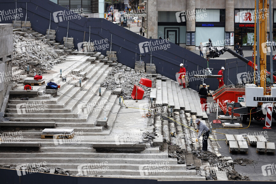 Granit, Stufen, Treppe, Meißeln, Sanierung, Sanierungsfall, Freitreppe, Domtreppe, kaputt, Bauen, Bauarbeiten, Kölner Wahrzeichen, Generalsanierung, Kölner Baustellen, Baukosten, Sanieren, Steintreppe, Großbaustelle, Millionen-Kosten, Pfusch am Bau, Menschenaufkommen, Verschleiß, Baubeschluss, Regressansprüche, Passanten, Reparatur, Reparaturen, Bauzaun, Bausicherheit, Baubranche, Baulärm
