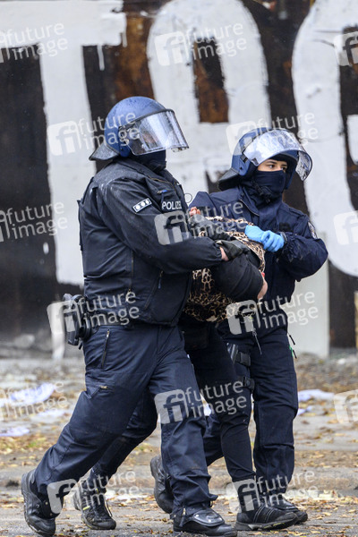 Räumung des linksautonomen Wagenplatzes 'Köpi'. Die Bewohner hatten im Vorfeld angekündigt, sie wollen nicht kampflos aufgeben. Rund eine Stunde haben die Barrikaden des linksautonomen Wagencamps gehalten, dann durchbrach die Polizei den Zaun an mehreren Stellen. Es gab Festnahmen. Berlin, 15.10.2021
