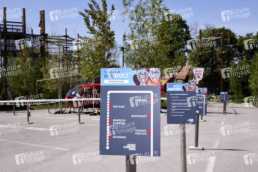 Das Volksfest Taufkirchner Auto Dult auf dem Gelände der Jochen Schweizer Arena ist in Corona-Zeiten an folgende Bedingungen geknüpft: Abholung nur als Drive-In, Bestellung am Auto, Mundschutz tragen und Verzehr nur im Auto oder Zuhause erlaubt. Taufkirchen, 08.05.2020