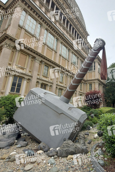 Thors Hammer 'Mjölnir' vor dem Museo Nazionale del Cinema im Mole Antonelliana, wo die Ausstellung 'Movie Icons' zu sehen ist. Mailand, 01.08.2024