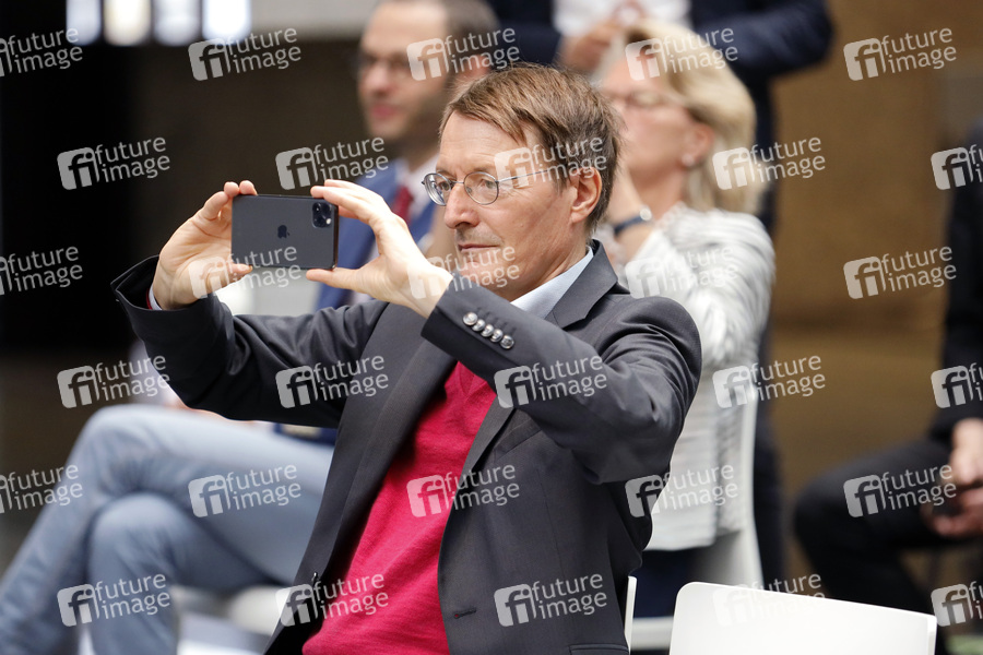 Karl Lauterbach fotografiert Özlem Türeci und Ugur Sahin, den Gründern des Biotechnologie-Unternehmens Biontech, bei ihrer Verleihung der bei der Verleihung der Ehrendoktorwürde der Medizinischen Fakultät der Uni Köln und der Eintragung ins Goldene Buch der Stadt Köln. Köln, 17.09.2021