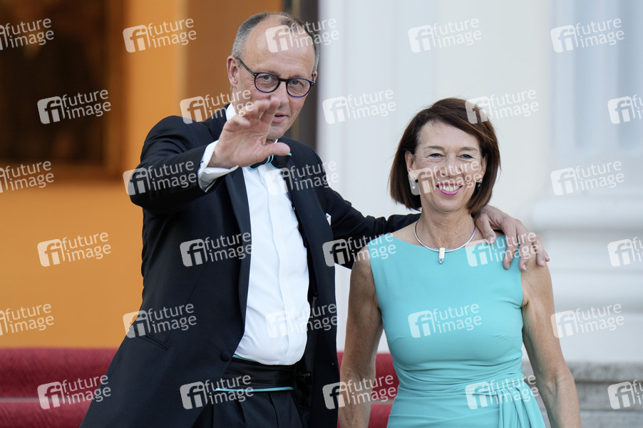 Friedrich Merz mit Ehefrau Charlotte Merz bei der Ankunft zum Staatsbankett zu Ehren des Staatspräsidenten der Französischen Republik im Schloss Bellevue. Berlin, 26.05.2024