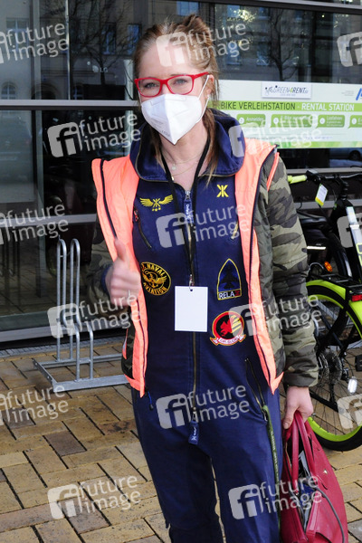 Doreen Dietel bei der Ankunft zur Aufzeichnung der MDR-Talkshow 'Riverboat' im Studio 3 der Media City Leipzig. Leipzig, 19.02.2021