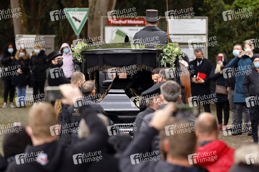 Kutsche mit Sarg und Trauergästen bei der Trauerfeier und Beerdigung von Willi Herren auf dem Melaten Friedhof. Köln, 05.05.2021