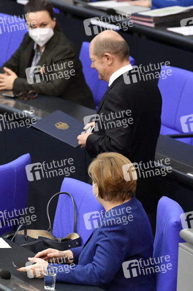 Olaf Scholz und Angela Merkel in der 212. Sitzung des Deutschen Bundestages im Reichstagsgebäude. Berlin, 25.02.2021