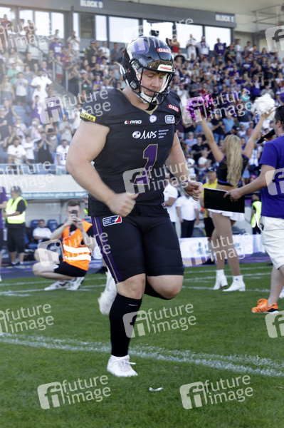Ryan Rimmler (1) beim American Football-Spiel Frankfurt Galaxy gegen Madrid Bravos in der PSD Bank Arena Frankfurt. Frankfurt am Main, 10.08.2024