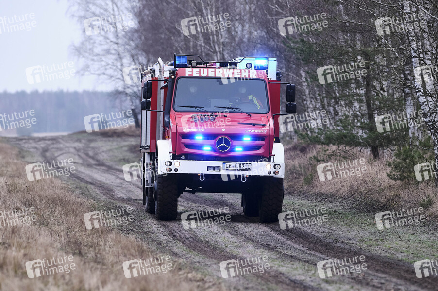 Erprobung eines neuen Waldbrandlöschfahrzeuges von Mercedes Benz Unimog auf dem Truppenübungsplatz des Niedersächsischen Landesamtes für Brand- und Katastrophenschutz und Übergabe an die Feuerwehr Heidekreis Niedersächsisches Landesamt für Brand- und Katastrophenschutz. Celle, 01.03.2021
