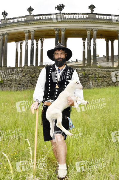 Schäfer Alex Beer bei der Ankunft der Schafe für die Beweidung von Wiesenflächen im Park Sanssouci. Potsdam, 19.05.2020