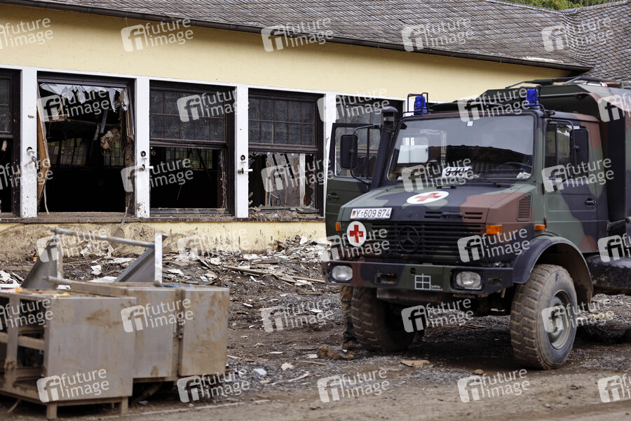 Nach dem Jahrhunderthochwasser in der Eifel durch heftige Regenfälle und Dauerregen mit Überschwemmungen und Überflutungen haben die Aufräumarbeiten im Ahrtal große Fortschritte gemacht. Einheiten von Polizei, THW, Bundeswehr und Feuerwehr mitsamt vielen freiwilligen Helfern haben Straßen geräumt, Schutt und Schlamm entfernt und die Menschen versorgt. Der Wiederaufbau wird trotzdem Jahre dauern. Im Bild Flutschäden in der Ortschaft Mayschoß, in der die Flut viele Häuser zerstörte, 08.08.2021