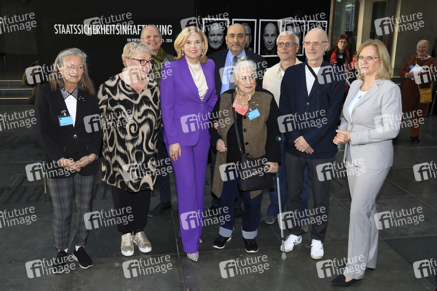 Evelyn Zupke, Julia Klöckner, Edda Schönherz und Andre Wagenzik mit Gästen bei der Ausstellungseröffnung über ehemalige politische Häftlinge in der DDR unter dem Titel 'Staatssicherheitsinhaftierung / Porträt 2023 - 2024' mit Fotos von Andre Wagenzik im Paul-Löbe-Haus. Berlin, 08.04.2025