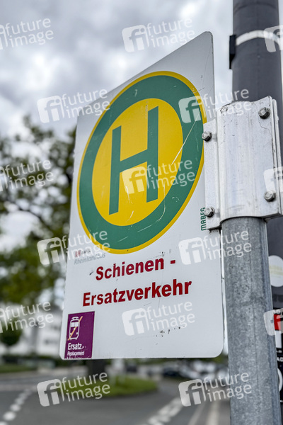 Im Rahmen von Streckenmodernisierungen oder Störungen des Eisenbahnbetriebes, richtet die Bahn einen Schienen-Ersatzverkehr mit Bussen ein. Hierdurch verlängert sich die Reisezeit oft erheblich zum Beispiel durch Verkehrsstaus auf den Straßen. Die Bushaltestellen zum Schienen-Ersatzverkehr werden in den Bahnhöfen durch auffällige Hinweisbanner und Schilder hingewiesen. (Symbolfoto, Themenfoto) Köln, 17.05.2025