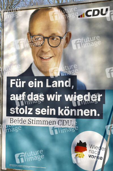 Beeinflussung der Wählerin, Botschaft, Bundestagswahl, Bundestagswahlen, Bundestagswahlkampf, Eigenwerbung, Kleinflächenplakat, Kampagne, Kandidat, Kandidaten, Kandidierende, Logo, Partei, Partei-Symbol, Parteien, Parteienwerbung, Parteilogo, Plakat, Plakatkampagne, Plakatständer, Politik, Politiker, Politikerinnen, Protestwähler, Slogan, Stammwähler, Wahl, Wahlbeeinflussung, Wahlbeteiligung, Wählen, Wählerschicht, Wählerschichten, Wahlkampagne, Wahlkampf, Wahlkampfmodus, Wahlkandidat, Wahlprogramm, Wahltermin, Wahlwerbung, Wirkung, Wirkungsmacht, Christlich Demokratische Union Deutschlands, CDU, Friedrich Merz, Symbolbild, Symbolfoto, Themenbild, Themenfoto