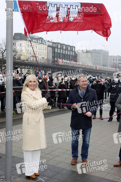 Marion Fedder und Jens Kerstan bei der Einweihung der Jan-Fedder-Promenade. Die bislang nicht offiziell benannte Uferpromenade am Hafen zwischen Landungsbrücken und Baumwall trägt jetzt den Namen des Hamburger Volksschauspielers und Ehrenkommissars der Polizei Hamburg. Hamburg, 14.01.2022