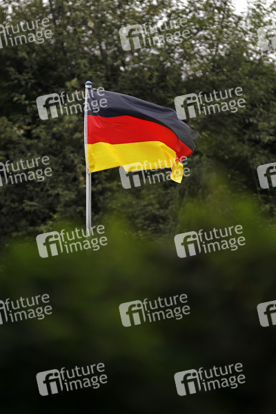 Eine Deutschlandfahne weht in einer Kleingartenanlage in Bonn. Viele Kleingärtner hissen gerne Fahnen in ihrer Parzelle. (Themenbild, Symbolbild) Bonn, 05.07.2021