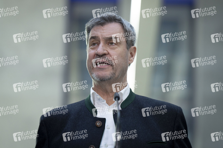 Markus Söder bei einer Pressekonferenz nach den Sondierungsgesprächen der Partei- und Fraktionsspitzen von SPD, CDU und CSU im Reichstagsgebäude. Berlin, 08.03.2025