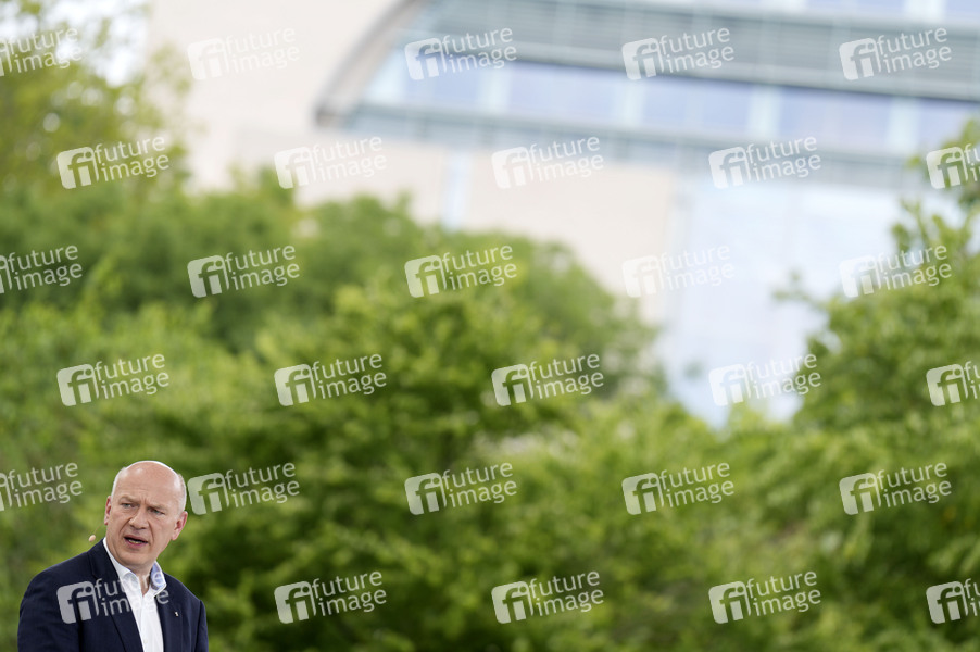 Kai Wegner beim Talk auf der 360-Grad-Bühne beim Demokratiefest zu 75 Jahren Grundgesetz zwischen Kanzleramt und den Deutschen Bundestag. Berlin, 25.05.2024