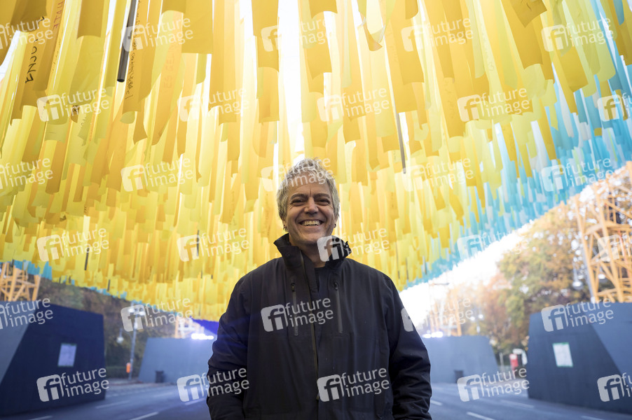 Patrick Shearn mit seiner Kunstinstallation 'Visions in Motions' auf der Straße des 17. Juni vor dem Brandenburger Tor, anlässlich der Feierlichkeiten zum 30. Jahrestags des Mauerfalls. Die 150 Meter lange Installation besteht aus 100.000 Stoffstreifen, von denen 30.000 mit kleinen Botschaften mit Wünsche und Erinnerungen zum Mauerfall beschriftet sind. Berlin, 09.11.2019